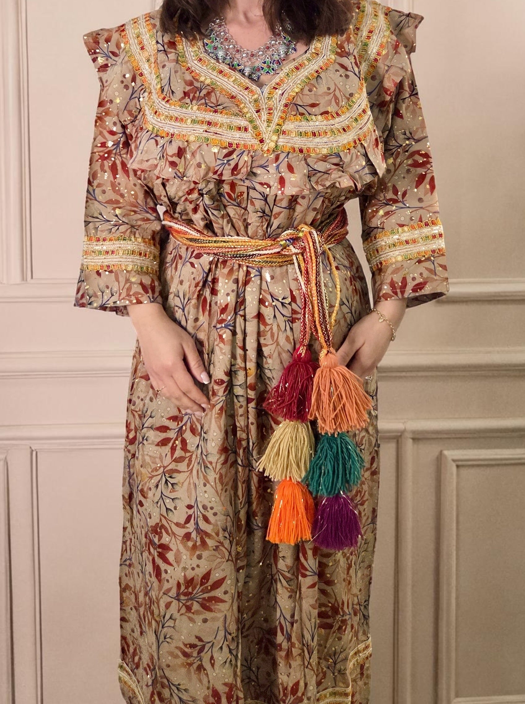 Craquez pour cette robe kabyle traditionnelle fleurie, une nouveauté tendance qui allie élégance et modernité. Son tissu légèrement brillant apporte une touche lumineuse idéale pour vos occasions spéciales.